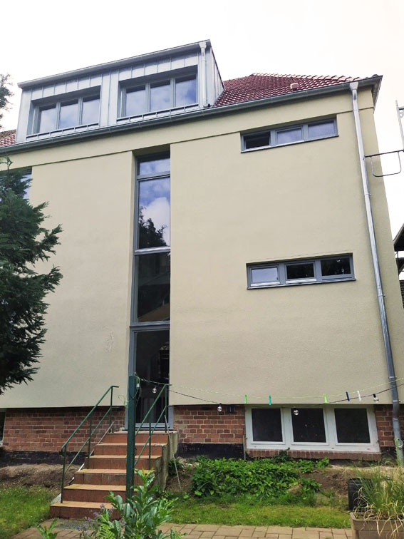 In dem beliebten Wohnquartier Gartenstadt befindet sich die sanierte Doppelhaushälfte, die ursprünglich im Stile der Neuen Sachlichkeit errichtet wurde. Das Dach, die Fassade sowie die Fenster und Außentüren wurden oberhalb der Kellerlage energetisch saniert. In dem Zuge wurde der Dachstuhl mit Gaubenanlage erneuert und so der Dachraum großzügig erweitert. Bei der energetischen Sanierung der Fassade wurde auf den Charakter der vorhandenen Architektur behutsam eingegangen. Die Fensteraufteilung blieb grundsätzlich erhalten, gartenseitig wurde jedoch ein vertikales Fensterband eingezogen, um die Belichtung des Treppenhauses zu verbessern und um neue Blickachsen in den idyllischen Garten freizugeben. Details wie den Erhalt der Klinkereinfassung Außentür ergänzen das Miteinander Alt und Neu.